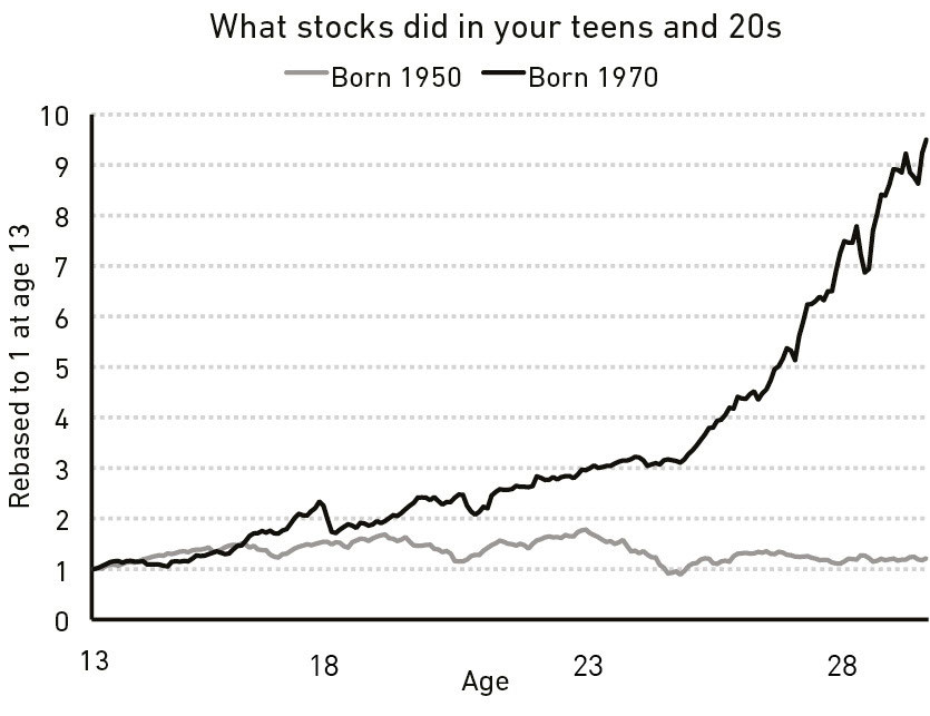 Take stocks. If you were born in 1970, the S&P 500 increased almost 10-fold, adjusted for inflation, during your teens and 20s. That’s an amazing return. If you were born in 1950, the market went literally nowhere in your teens and 20s adjusted for inflation. Two groups of people, separated by chance of their birth year, go through life with a completely different view on how the stock market works: