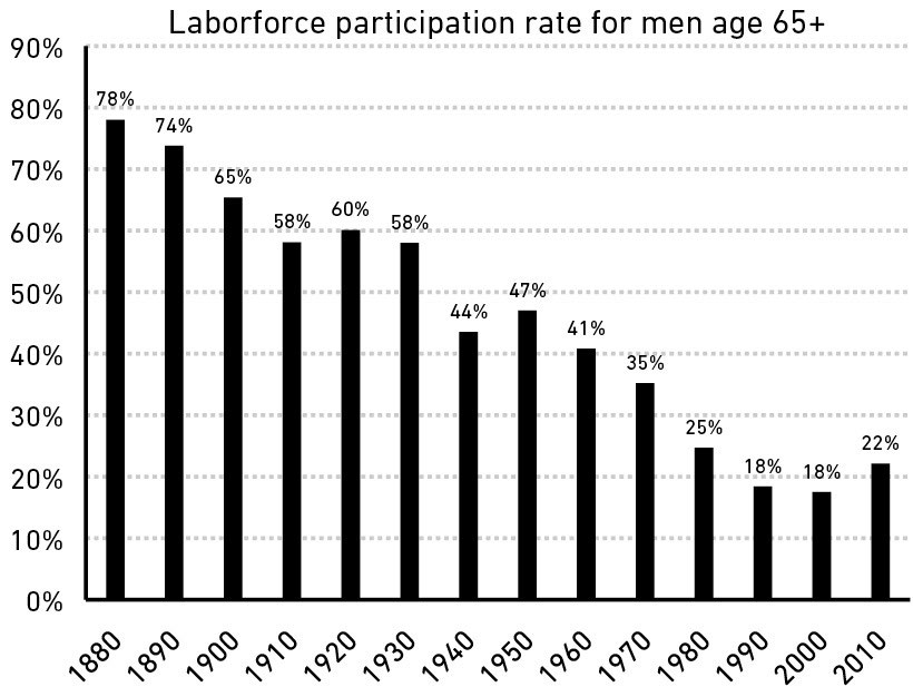 Before World War II most Americans worked until they died. That was the expectation and the reality. The labor force participation rate of men age 65 and over was above 50% until the 1940s: