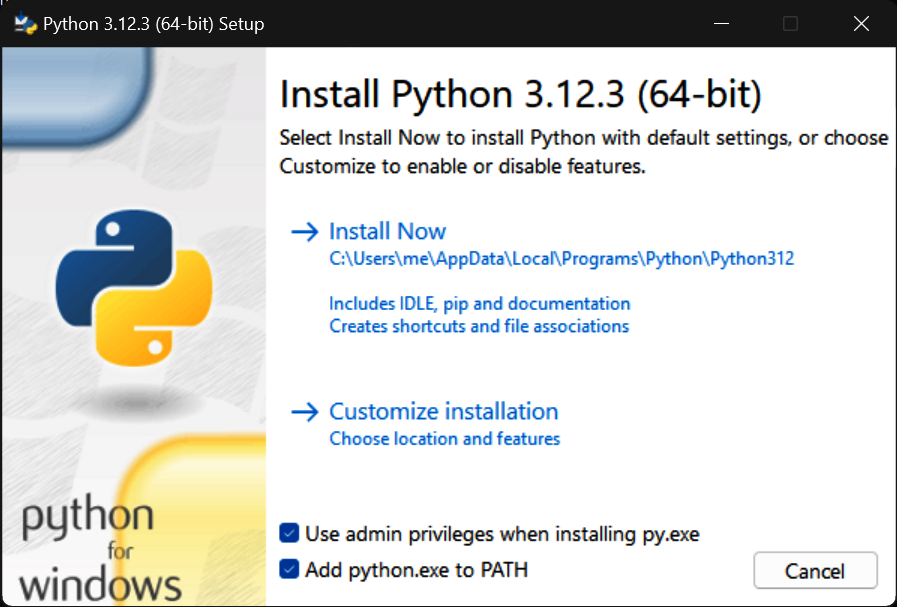 In more detail, the recommended way to install Python for Windows begins with a visit to the Downloads page at python.org. There, you’ll fetch a Windows self-installer that you’ll run to install Python 3.X, along with its IDLE GUI and standard library (including the library’s tkinter GUI toolkit). Figure A-1 captures the Python installer in action; allow it to run if Windows asks for permission. You can generally accept all installation defaults, but it’s recommended to opt in to both adding Python to your PATH at the start of the install and lifting the Windows path-length limits for filenames at the end.