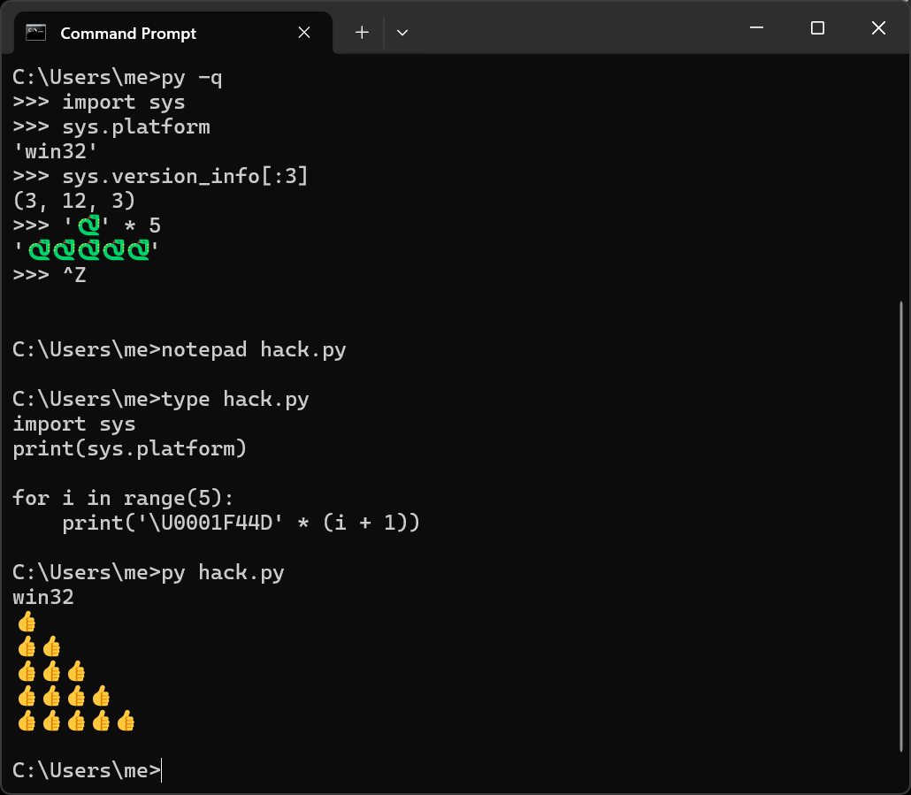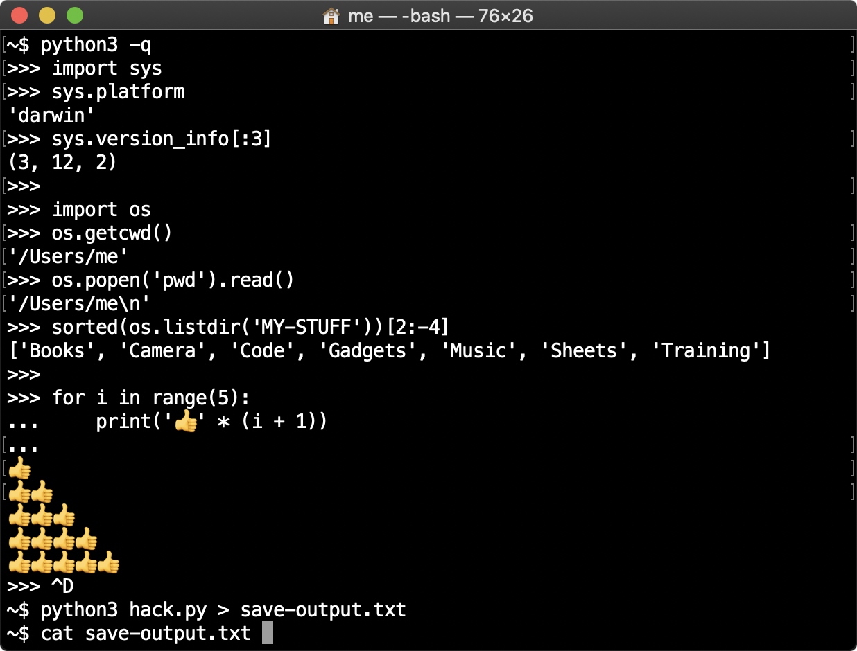 You can also start Python with command python if you opted to add Python to your system PATH during the install, though it’s pointless extra typing (python3 works too, but only if you installed from the Store per the earlier note). And just as on Unix, you can easily save a script’s printed output to a file by adding > filename.txt to the end of a command (see Chapter 3 for more on such stream redirections).