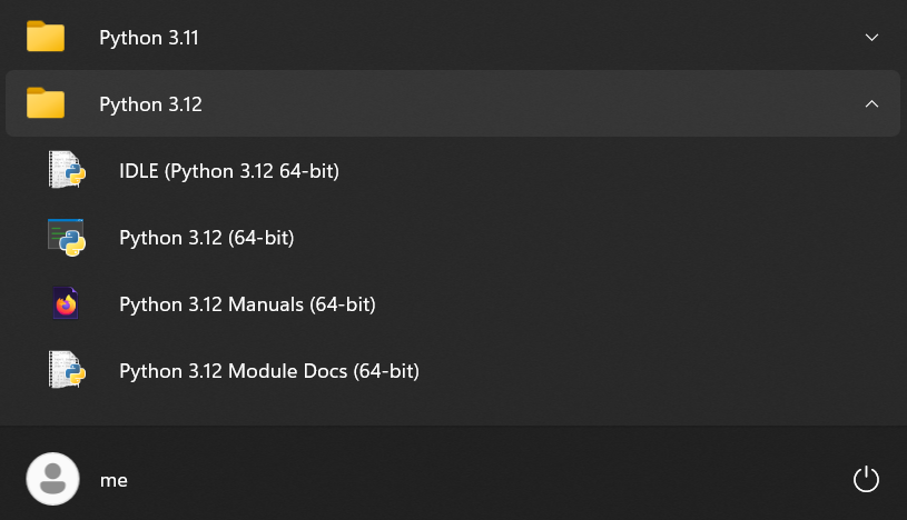 Besides command lines, you can also start Python’s interactive session by clicking the Python 3.12 (64-bit) (or similar) item in its Start-menu entry, shown in Figure A-3. This starts the usual Python REPL (Read-Eval-Print Loop) interactive session with its >>> prompt, just like an explicit py command in Command Prompt or PowerShell. You’ll still use py commands or other techniques, though, to run code files. In all console REPLs on Windows, type or tap the two-key combo Ctrl+Z (followed by Enter) at the >>> prompt to exit a Python interactive session or simply close the hosting window.