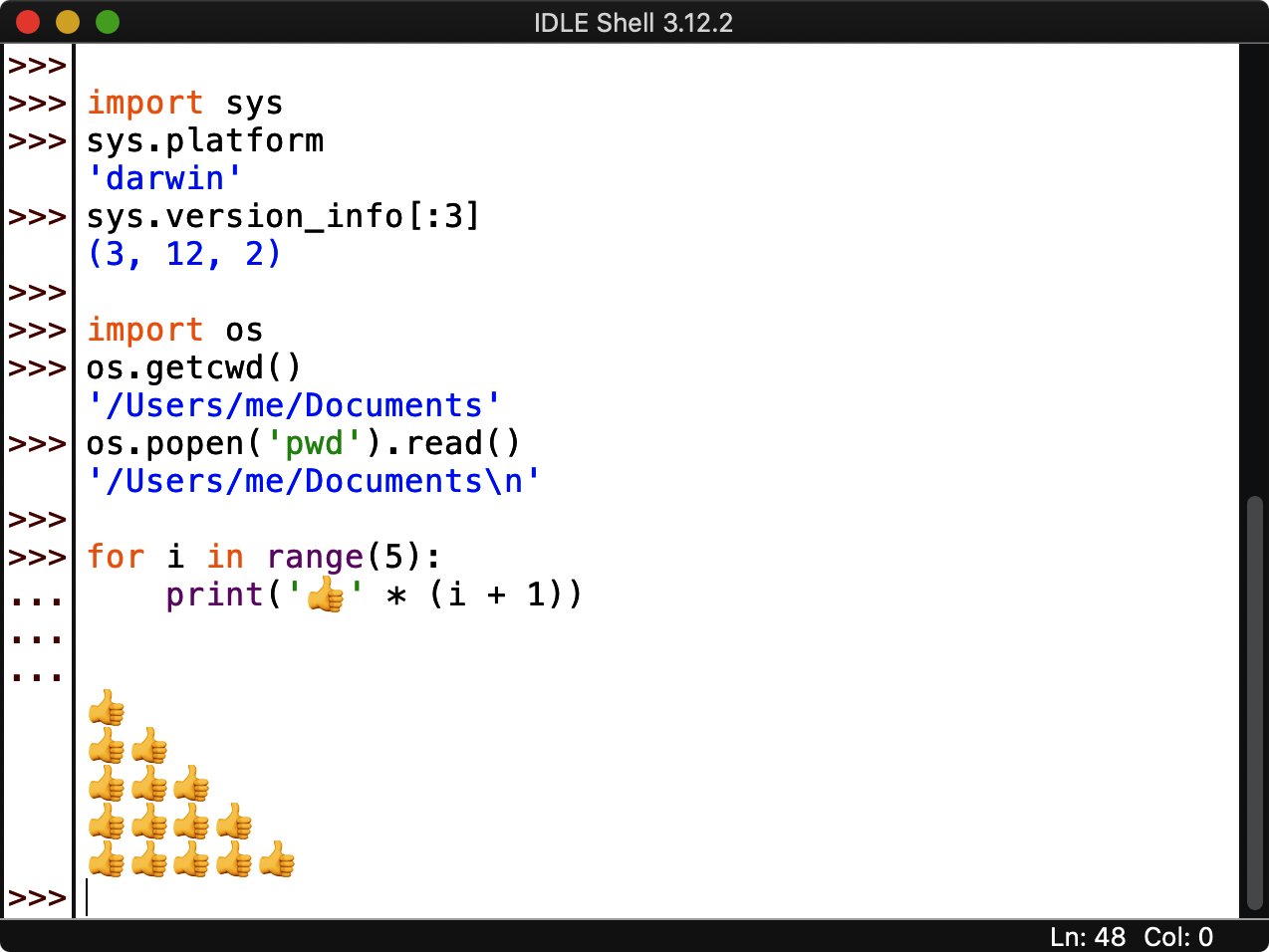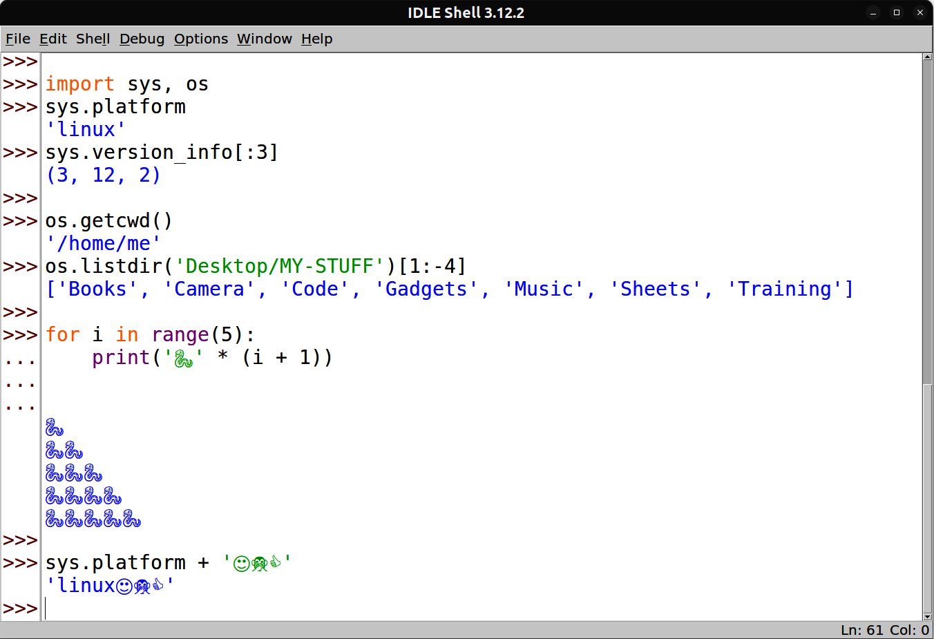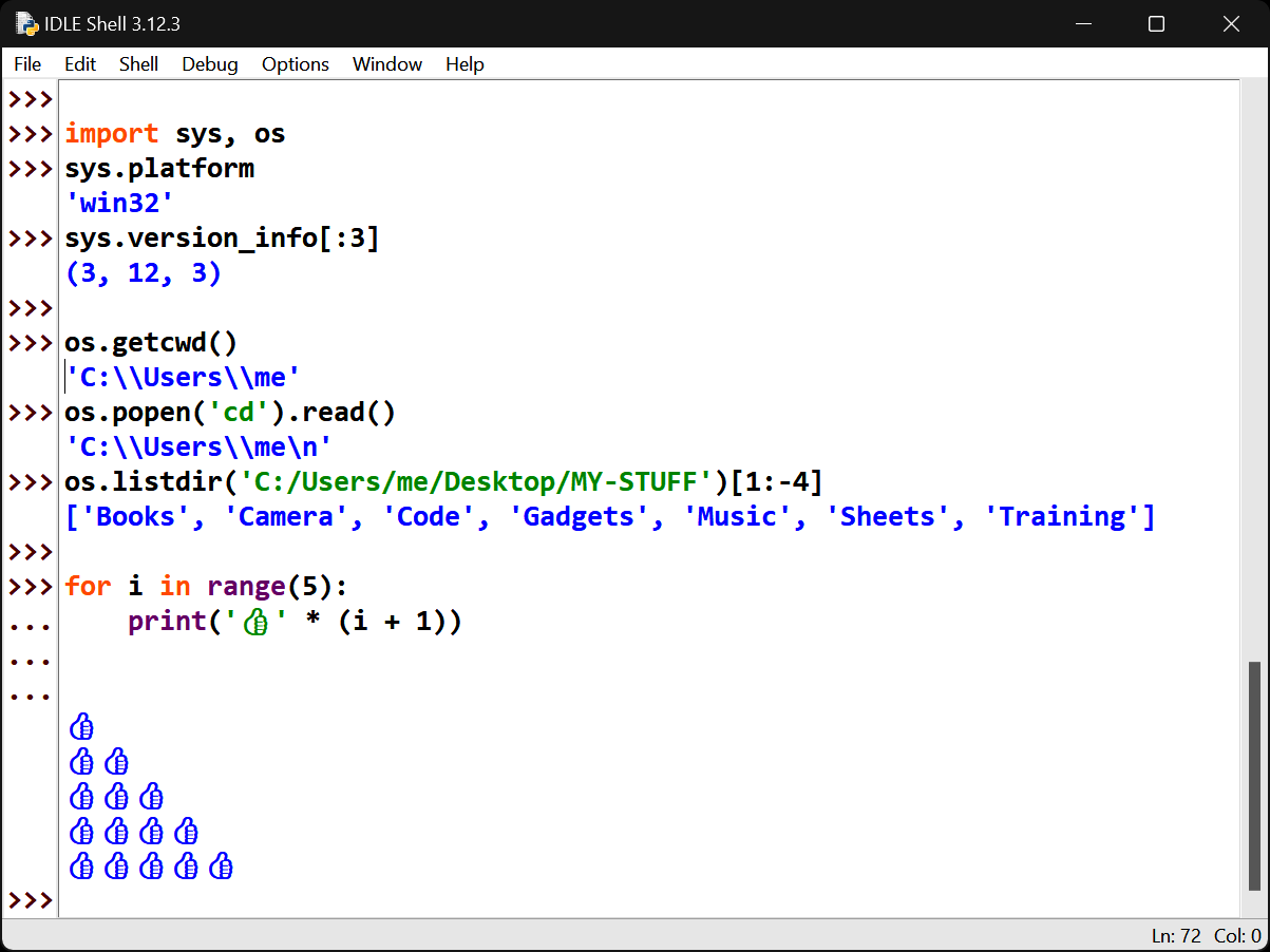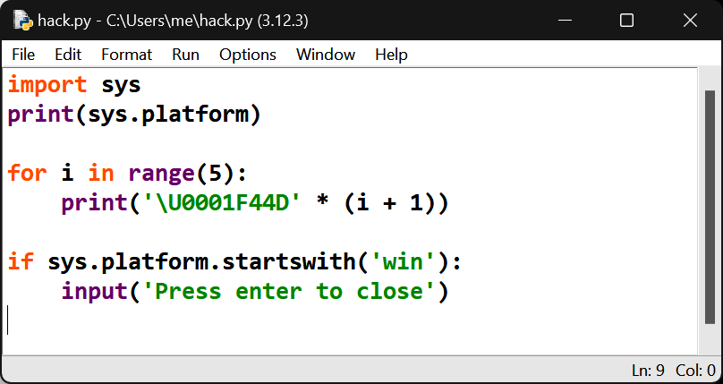 Because IDLE is coded in Python as a tkinter GUI, it looks and works the same on all supported platforms (essentially, all PCs sans mobile heroics). As elsewhere, it allows you to edit and run files of Python code without having to use command lines or other editors. See IDLE’s earlier Windows coverage for more tips; as noted there, IDLE can serve as a Python-friendly code editor, even if you run files by command lines, clicks, or drags.