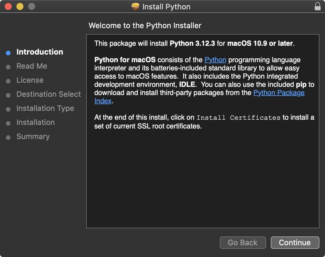 Installation convolution: If you type python3 in macOS’s Terminal before running the python.org install, you may get an Apple popup that asks if you want to install Python as part of Xcode’s “command line developer tools.” This is similar in spirit to the Microsoft Store redirect on Windows of the preceding section—and similarly confusing!