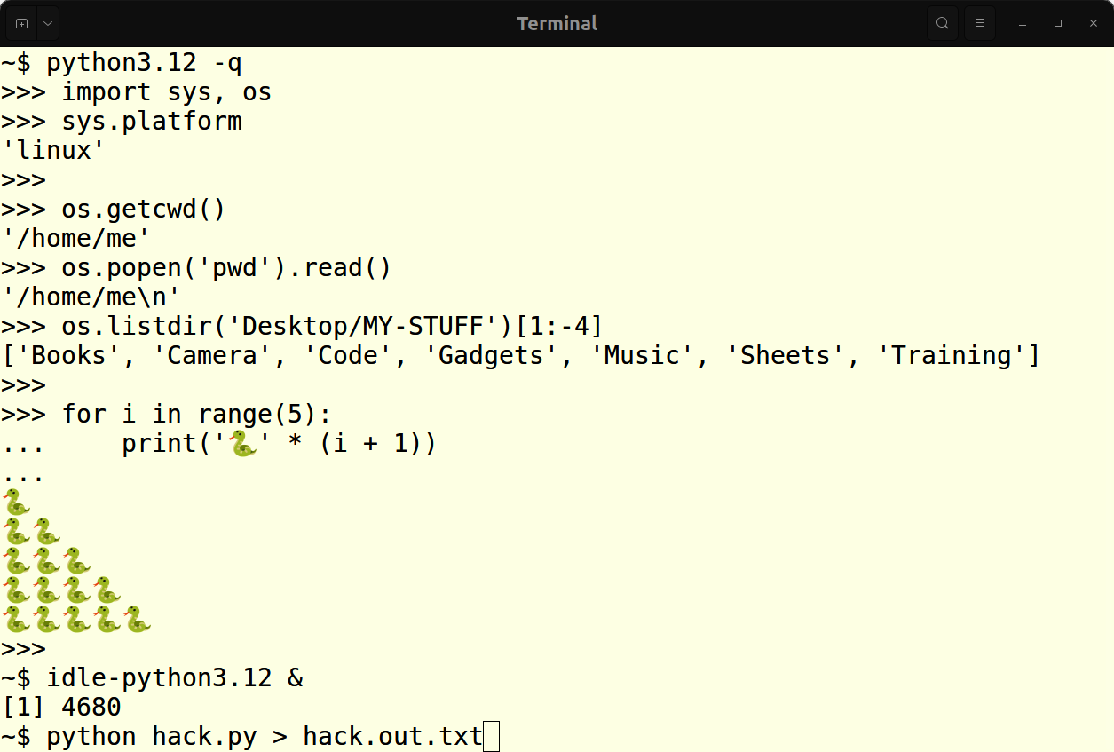 You can also use Python’s IDLE edit-and-run GUI on Linux. Launch it with an idle command line after installing it with sudo apt install idle3, or similar on other distributions. A code-file right-click and Open With in file explorers may start IDLE too.