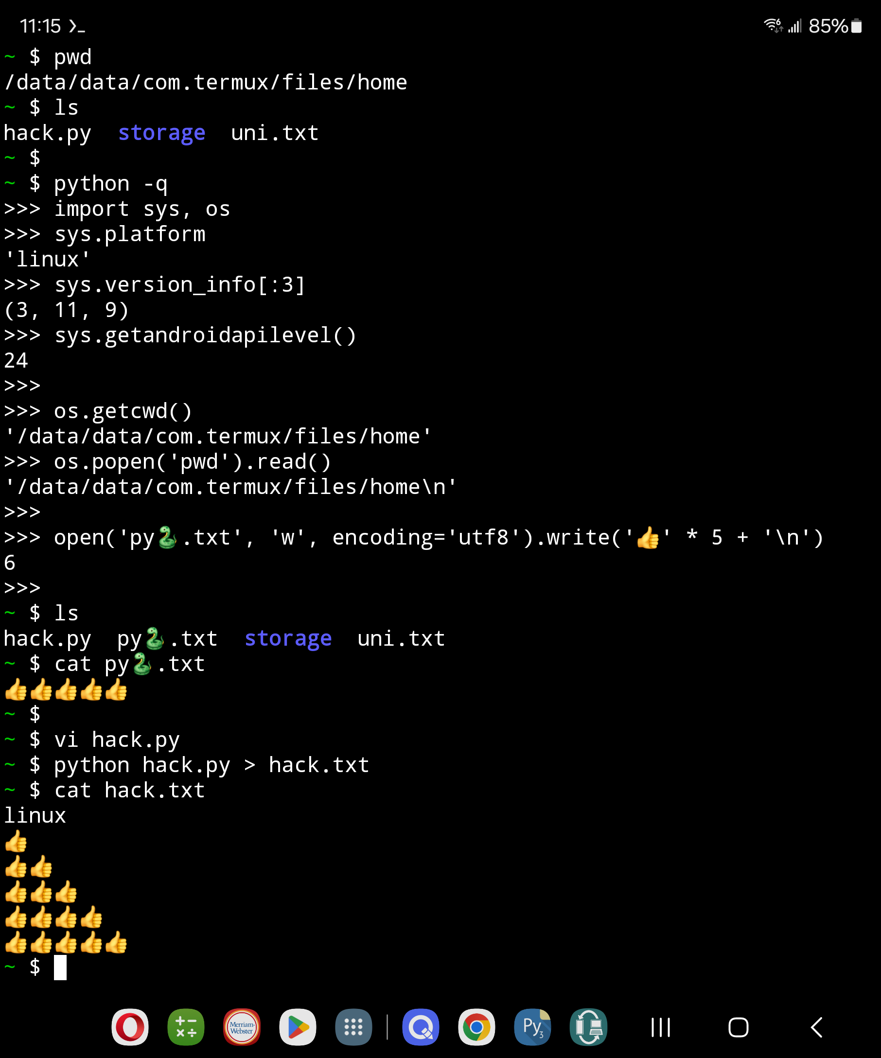 Termux opens with a standard Bash command-line shell, where you can tap out commands to launch an interactive Python session with python, and run a file of code by adding a filename (e.g., python script.py). Stream redirection works as on all Unix, and command python3 is the same as python if you prefer Unix uniformity and don’t mind the extra tap. Both commands are automatically usable post install without PATH mods.