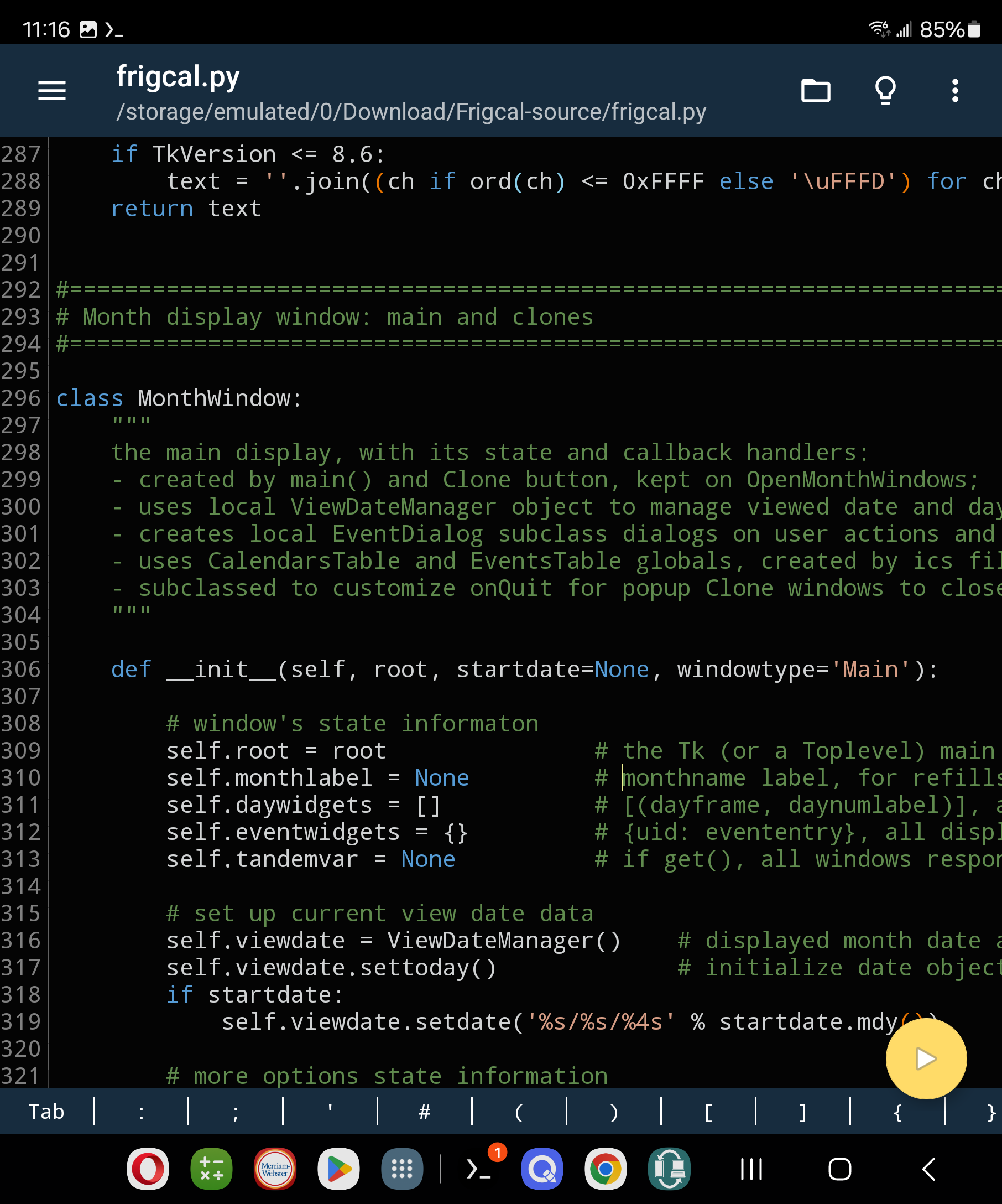 Pydroid 3 is today installed from Play. Its shell and interactive session are less user-friendly than the richer command-line support in Termux, but its IDE may seem more comfortable for users unaccustomed to command lines. Similar in spirit to IDLE on PCs, this app’s IDE allows you to edit Python code, and launch it with a simple (and yellow) button press.