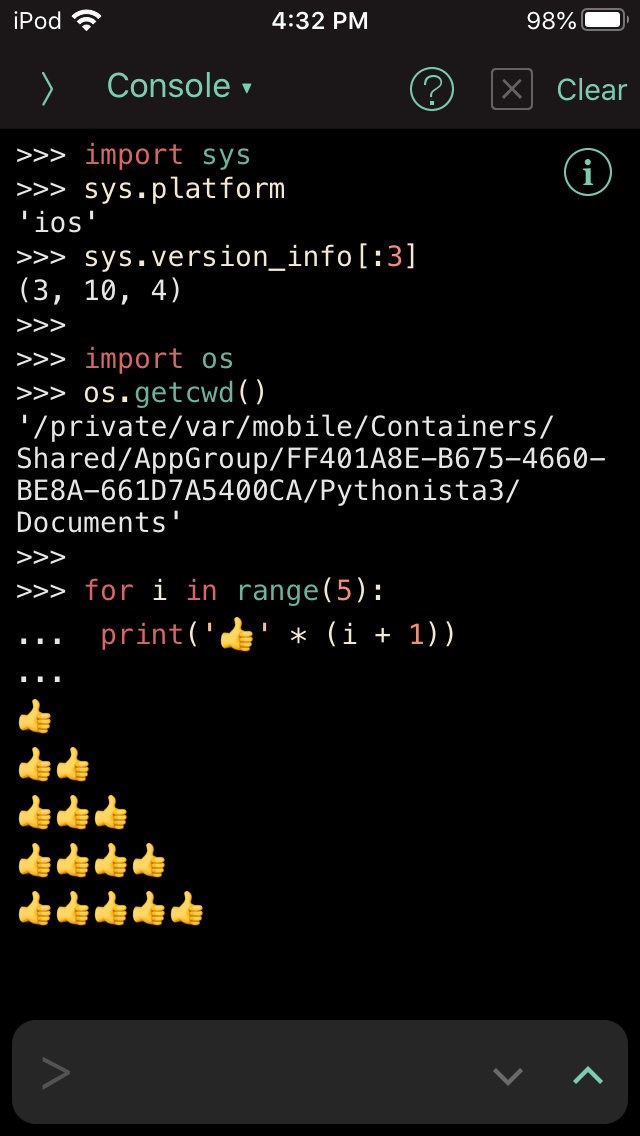 Like Android, you’ll normally use Python on your iOS devices by installing an app that runs Python code. Among these, Pythonista 3 provides an interactive Python session and a GUI for editing and running files of code, as in other IDEs. In addition, this app comes with access to native iOS features and a toolkit for building GUIs in Python for iOS. It also can share code files with the Files app to be opened with taps.