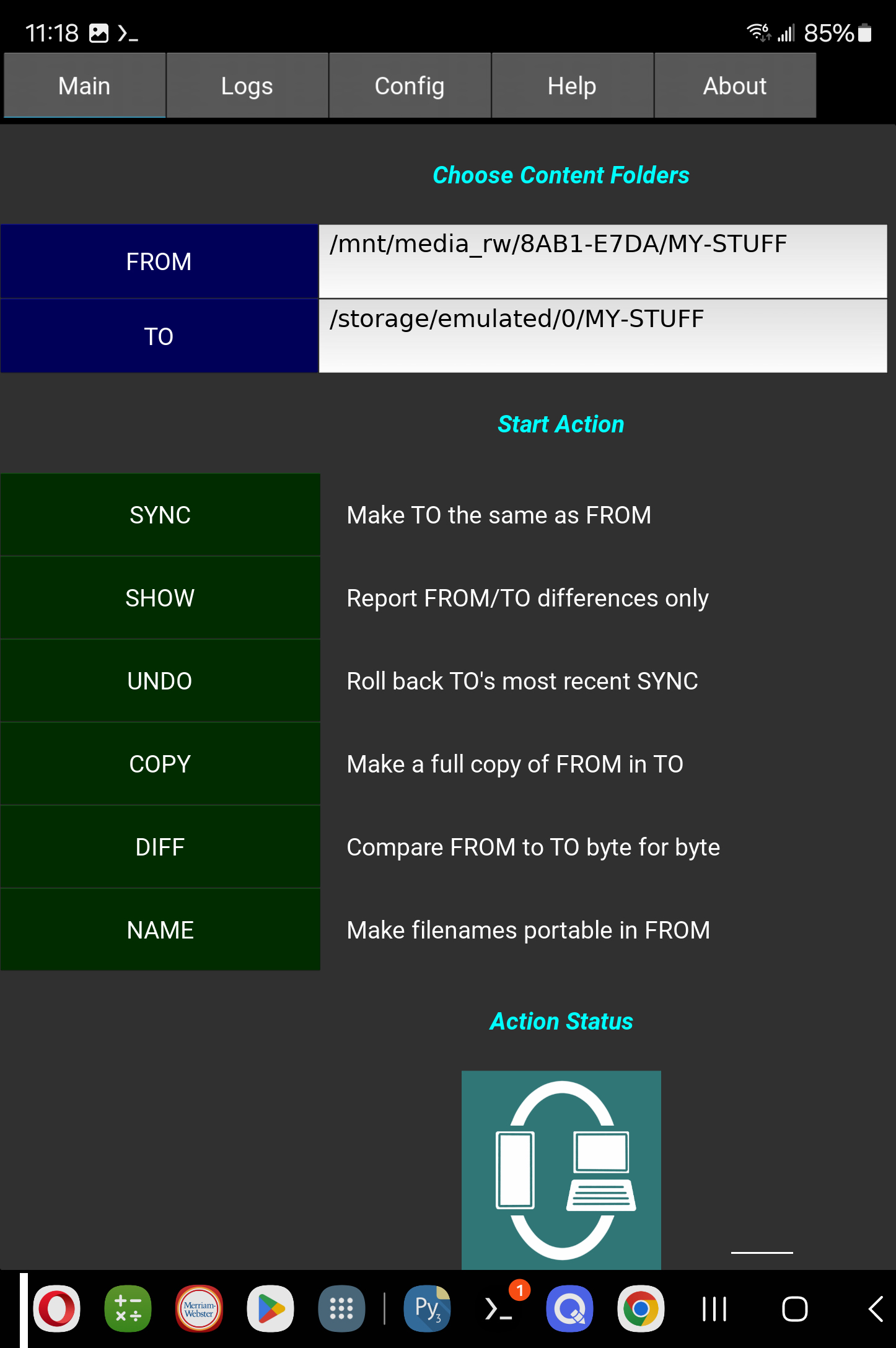 As a demo, Figure A-16 captures one of many Python-coded standalone apps for Android, running on a foldable. This app, made by this book’s author, is freely available in the Play store; is built for Android with Buildozer; uses the portable Kivy toolkit for its GUI; and relies on Kivy’s pyjnius to access Android Java APIs when required in a small fraction of its code (e.g., to request permissions, run services, open docs, and get drive labels).
