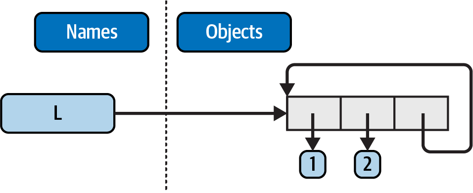 The reason for the cycle is subtle and requires information you will glean in Part II, so this is something of a preview. But in short, assignments in Python always generate references to objects, not copies of them. You can think of objects as chunks of memory and of references as implicitly followed pointers. When you run the first assignment above, the name L becomes a named reference to a two-item list object—a pointer to a piece of memory. Python lists are really arrays of object references, with an append method that changes the array in place by tacking on another object reference at the end. Here, the append call adds a reference to the front of L at the end of L, which leads to the cycle illustrated in Figure B-1: a pointer at the end of the list that points back to the front of the list.