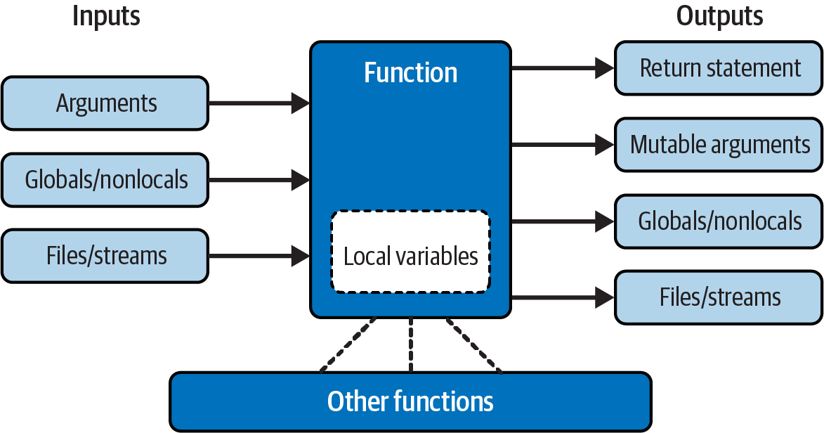 Figure 19-1 summarizes the ways functions can talk to the outside world; inputs may come from items on the left side, and results may be sent out in any of the forms on the right. Nonlocals might belong in this sketch too, but they’re mostly a state-retention tool in the same category as other local variables. Despite the array of options, good function designs prefer to use only arguments for inputs and return statements for outputs, whenever possible.