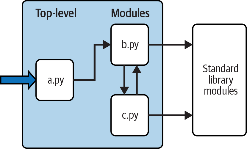 Imports are similarly general because any file can import tools from any other file. For instance, the file a.py in Figure 22-1 may import b.py to call its function, but b.py might also import c.py to leverage different tools defined there. In fact, import chains can go as deep as you like: in this example, module a can import b, which can import c, which can import b again, and so on. More realistically, in the benchmarking code of the prior chapter, test scripts imported runner modules, which imported timer modules.