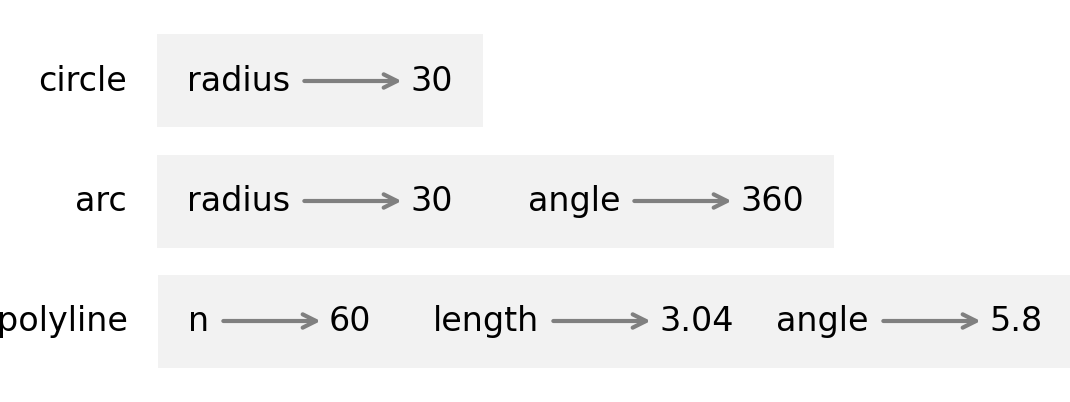For example, polyline requires three arguments: n has to be an integer, length should be a positive number, and angle has to be a number, which is understood to be in degrees.