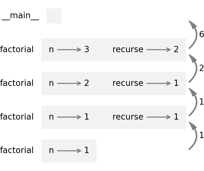 2is multiplied byn, which is3, and the result,6, becomes the return value of the function call that started the whole process.