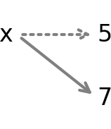 The dotted arrow indicates that x no longer refers to 5. The solid arrow indicates that it now refers to 7.
