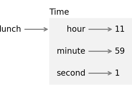 The variable lunch refers to a Time object, which contains three attributes. Each attribute refers to an integer. A state diagram like this—which shows an object and its attributes—is called an object diagram.