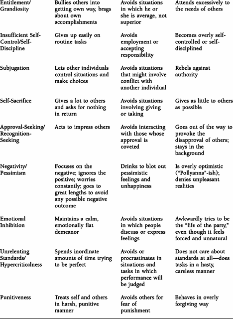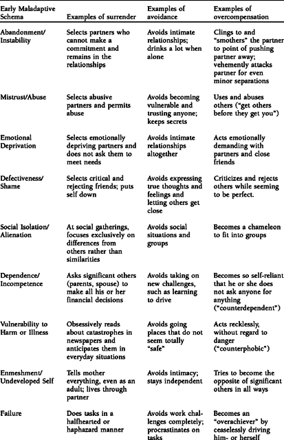 We have identified three dysfunctional coping modes: the Compliant Surrenderer, the Detached Protector, and the Overcompensator. These three modes correspond to the three coping styles of surrender, avoidance, and overcompensation. (Again, we tailor the name of the mode so that it fits the feelings and behaviors of the individual patient.) The Compliant Surrenderer submits to the schema, becoming once again the passive, helpless child who must give in to others. The Detached Protector withdraws psychologically from the pain of the schema by emotionally detaching, abusing substances, self-stimulating, avoiding people, or utilizing other forms of escape. The Overcompensator fights back either by mistreating others or by behaving in extreme ways in an attempt to disprove the schema in a manner that ultimately proves dysfunctional (see the previous discussion of overcompensation for examples). All three maladaptive coping modes ultimately perpetuate schemas.