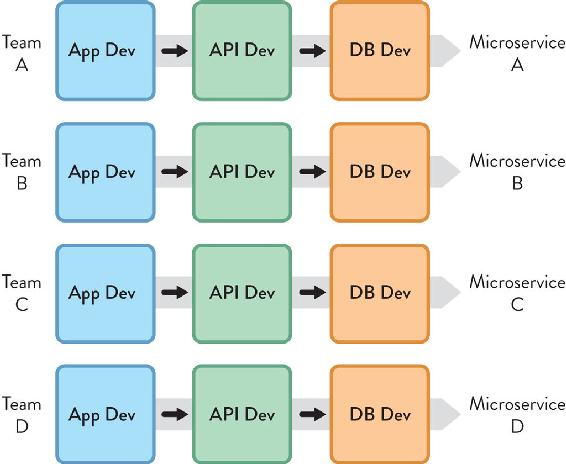By applying the reverse Conway maneuver, we can design our teams to “match” the required software architecture by having separate developers for the client applications and the API, and a database developer within the team rather than separate from it (Figure 2.4, see page 22).