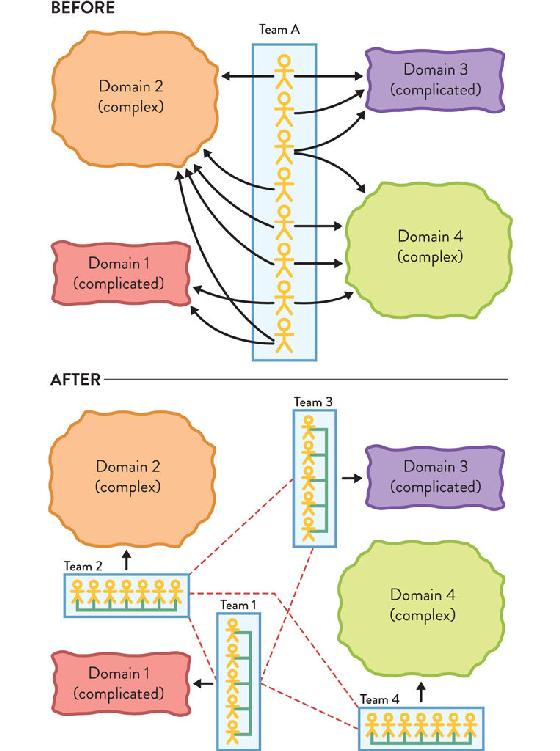 Before: a larger team is spread thin across four domains (two complicated and two complex) and struggles to perform well. Intra-team morale is negatively affected, with frequent context switches and individual disengagement. After: with multiple smaller teams each focusing on a single domain, motivation rises and the team delivers faster and more predictably. Low bandwidth inter-team collaboration allows solving occasional issues affecting two or more domains.