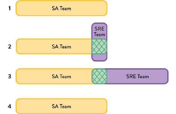 The SRE approach is a highly dynamic approach to building and running large-scale software systems. The SRE team has several different interactions with application development teams at different times, depending on various factors: how many users the software application has, how reliable the software is, how available the software needs to be from a product perspective, etc. Figure 4.3 illustrates this.