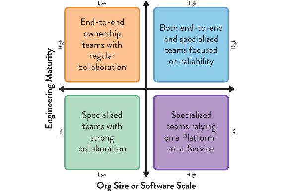 Low maturity organizations will need time to acquire the engineering and product development capabilities required for autonomous end-to-end teams. Meanwhile, more specialized teams (development, operations, security, and others) are an acceptable trade-off, as long as they collaborate closely to minimize wait times and quickly address issues. For a moderate scale of organization or software, patterns that emphasize close collaboration between teams at speed work well. As the size of the organization or software scale increases, focusing on providing the underlying infrastructure or platform as a service brings important benefits in terms of user-facing service reliability and the ability to meet customer expectations. If the organization has a high level of engineering maturity and discipline, then the SRE model described earlier may be effective at scale as well.