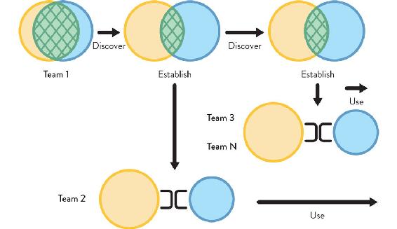 In a larger enterprise, this “discover to establish” pattern is expected to happen all the time with different teams at different stages of development. There should be multiple discovery activities happening simultaneously, with other teams taking advantage of well-defined APIs to be able to consume things as a service, as shown in Figure 8.7 (see page 160).