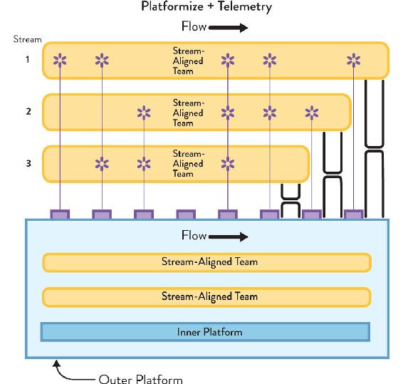 Increase flow predictability in higher-level business services (streams) through the use of a “platform wrapper” to “platformize” the lower-level services and APIs, allowing the streams to treat all their dependencies as a single platform with a holistic roadmap and consistent DevEx. The streams also have rich telemetry to track flow and resource usage of the platform.