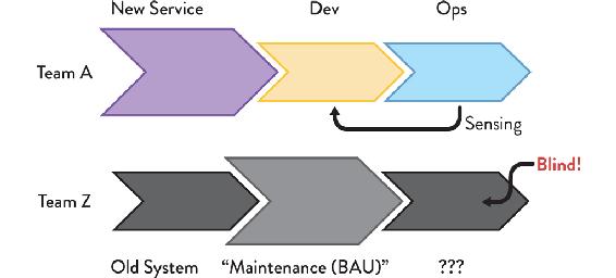 Having separate teams for new-stuff and BAU also tends to prevent learning between these two groups. The new-service team gets to implement new technologies and approaches but without any ability to see whether these approaches are effective. The new approaches may be damaging, but the new-service team has little incentive to care, as only the BAU team will feel the pain of these poor choices. Furthermore, the BAU team typically has little chance to apply newer telemetry techniques to existing software, leaving them blind to the signals potentially available to indicate customer happiness or unhappiness.