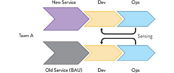 Instead, it is much more effective to have one team responsible for new services and BAU of an existing system side by side. This helps the team to increase the quality of signals from the older system by retro-fitting telemetry from the newer system and increasing the organization’s ability to sense its environment and self steer (see Figure 8.10).